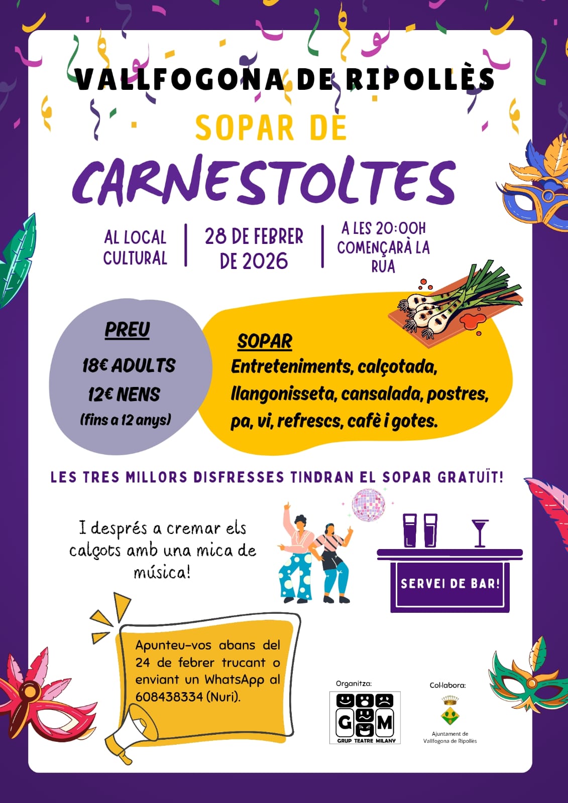 Dissabte, 28 de febrer, vine al Sopar de Carnestoltes que tindrà lloc al Local Cultural. Cal apuntar-se abans del 24 de febrer, trucant o enviant un WhatsApp al 608 43 83 34 (Nuri).