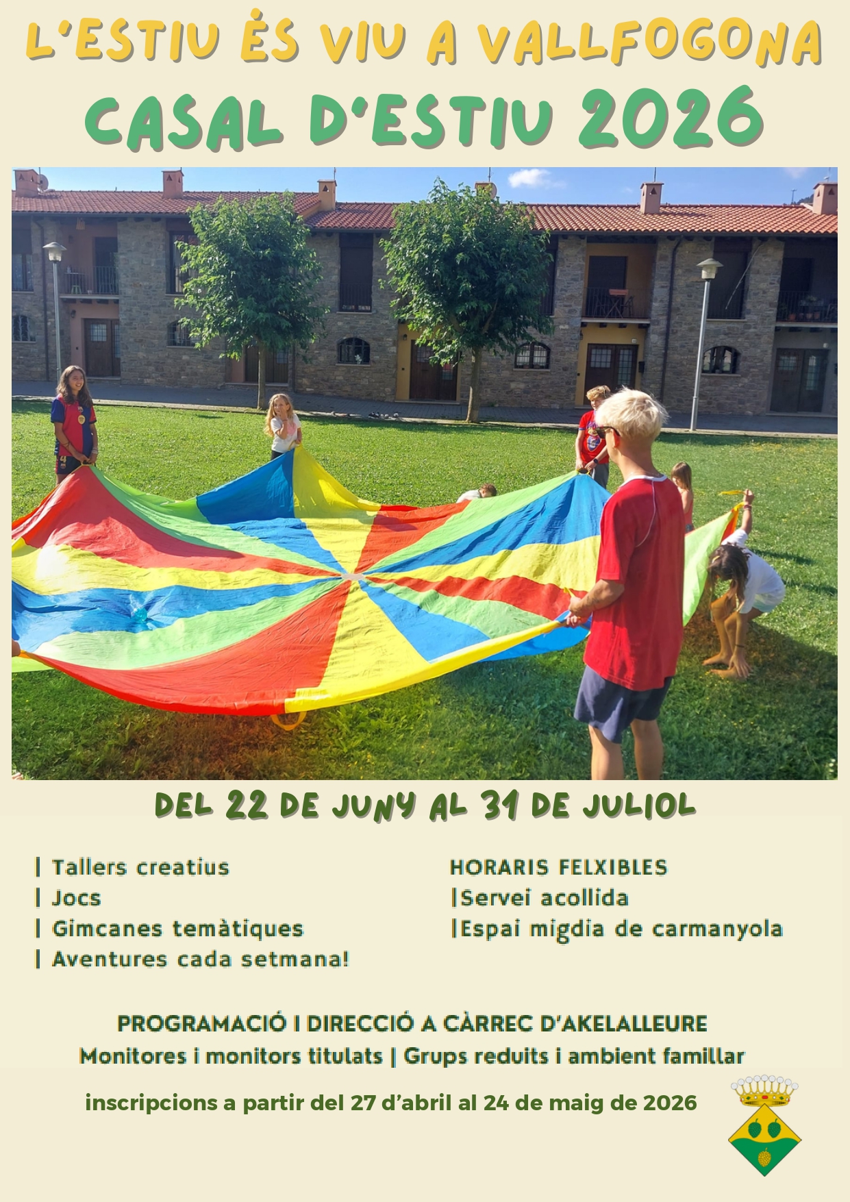Informació casal d’estiu 2026. A partir del 27 d’abril s’obriran les inscripcions a l’enllaç que es proporcionarà.
