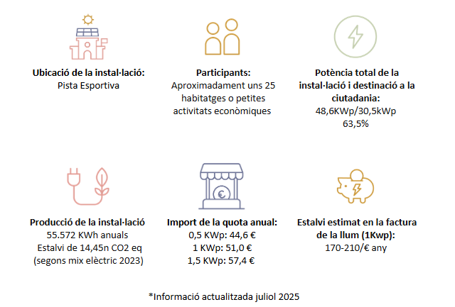 - Rebran l’energia generada de 1 o 0,5 kWp (que equivalen aproximadament a 3 i 1,5 panells solars respectivament) de la instal·lació fotovoltaica municipal, i el consegüent estalvi directe en factura a final de mes.