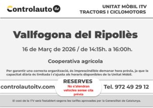 El 16 de març de 2026, de 14:15h. a 16:00h, a la Cooperativa agrícola, es desplaçarà fins a Vallfogona de Ripollès, una unitat mòbil que efectuarà les revisions ITV als vehicles agrícoles (tractors i remolcs), i als ciclomotors.
